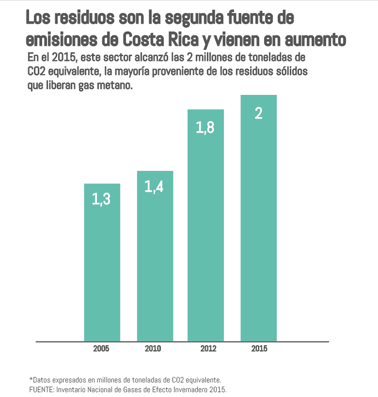 Las emisiones provenientes de la basura también se elevaron desde el 2005 y son la segunda principal fuente de gases contaminantes en Costa Rica. En el 2015, el sector superó las dos millones de toneladas de CO2 equivalente.