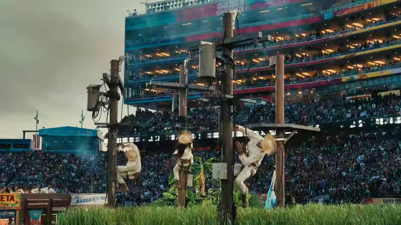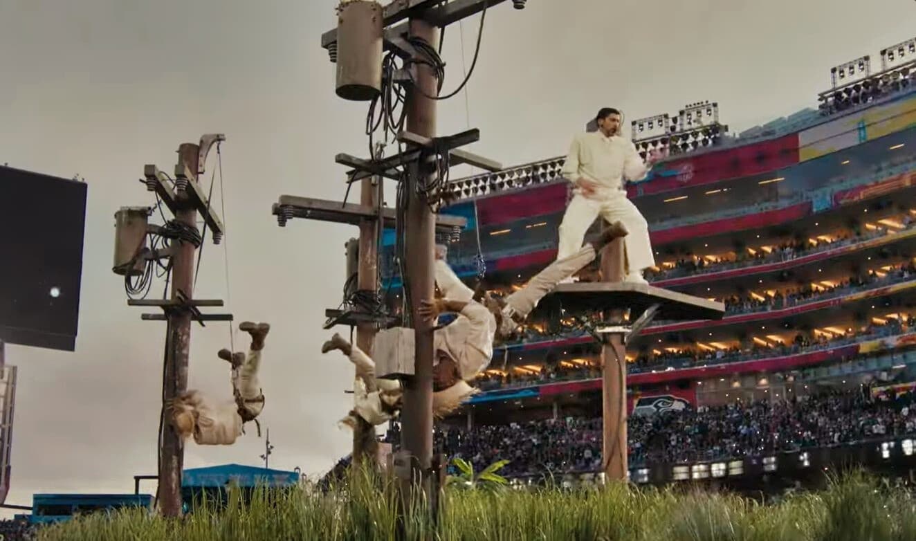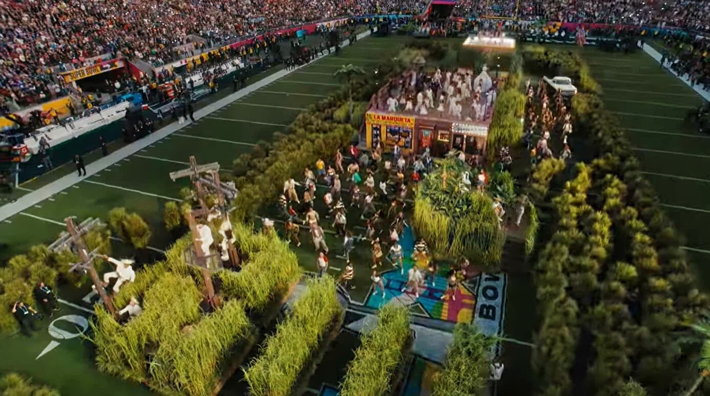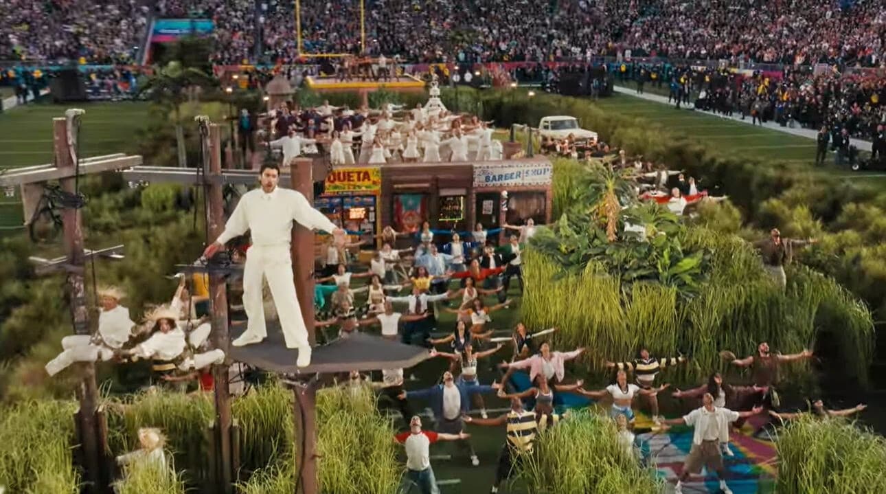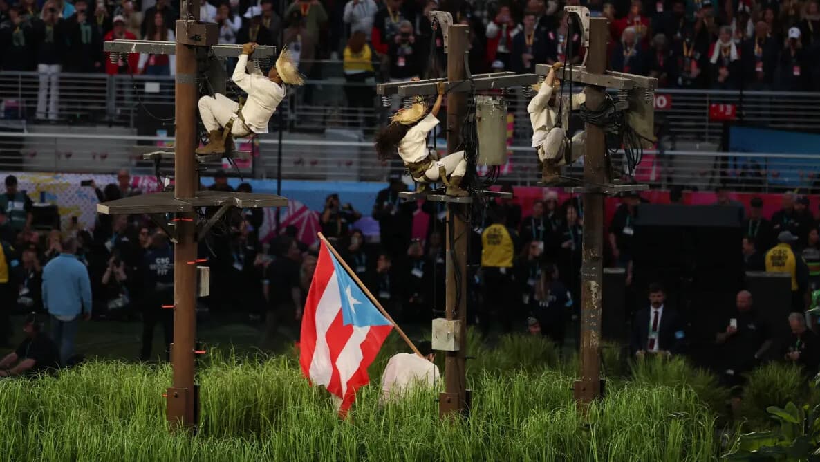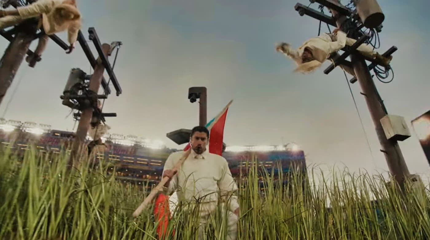 Izando la bandera de Puerto Rico, Bad Bunny se acerca a cuatro postes de luz que chispean mientras tres personas, vestidas de blanco y ataviadas con una pava (sombrero de ala ancha de los campesinos boricuas), danzan suspendidas en el aire.