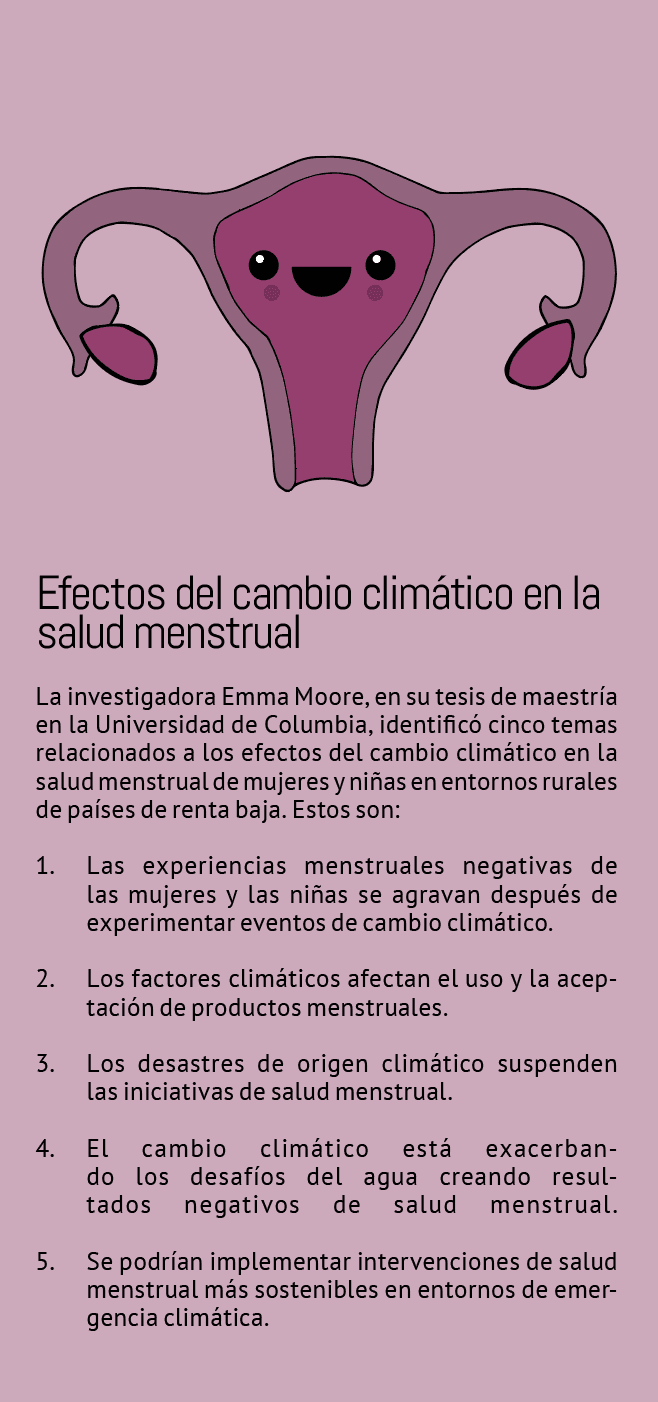 En cuanto a los más afectados, Picado fue claro: “los pobres y las personas en condición de vulnerabilidad”. “Esto debido a que los recursos son limitados y las poblaciones están menos equipadas para dar respuestas adecuadas”, especificó Emma Moore en su tesis de maestría en la Universidad de Columbia (EE.UU.), en la que analiza los efectos del cambio climático en la salud menstrual de mujeres y niñas de zonas rurales de países de renta baja.