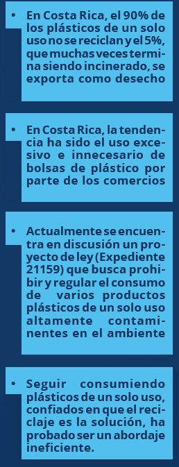 Es de conocimiento común que el plástico es un problema. Es prácticamente imposible de reciclar (en Costa Rica, el 90% de los plásticos de un solo uso no se reciclan y un 5%, que muchas veces termina siendo incinerado, se exporta como desecho), no es biodegradable, ha ingresado a nuestra cadena alimenticia y su producción y disposición inadecuada genera inmensas cantidades de gases de efecto invernadero que tienen un impacto negativo en el cambio climático.