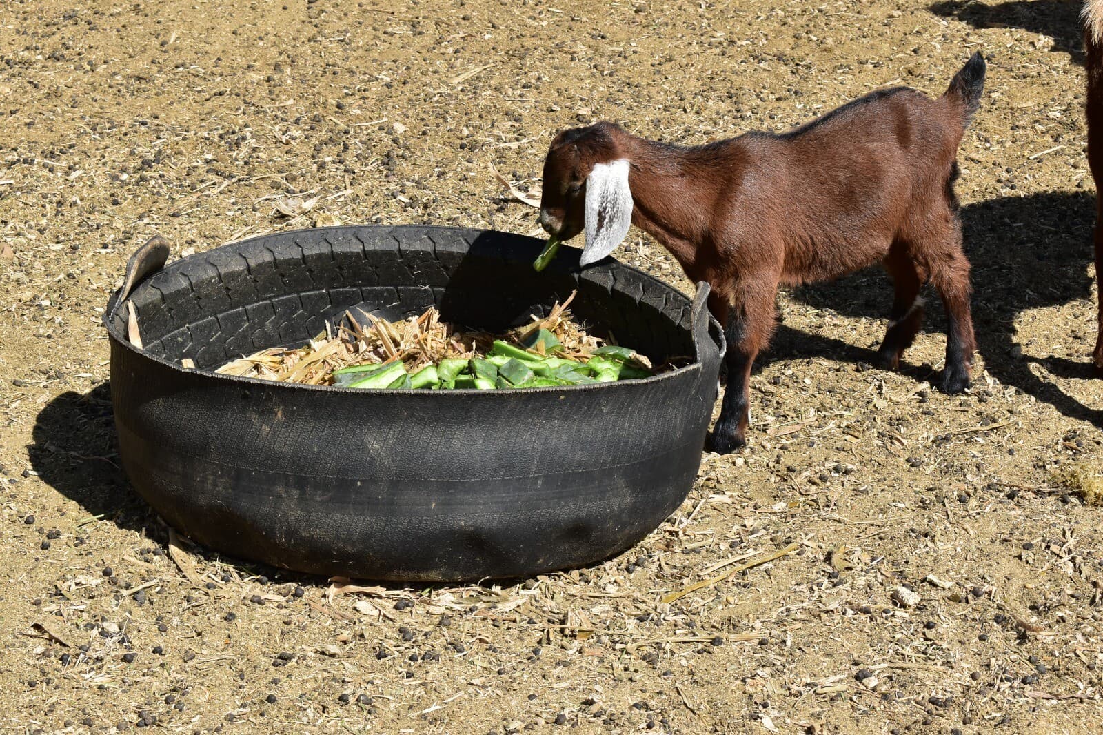 Un hombre alto con un sombrero largo que le cubre el rostro lleva una decena de pencas de tuna (Opuntia ficus-indica) en una carretilla, las coloca en una tabla y empieza a cortarlas en pequeños trozos. Al terminar, las lleva a un corral de cabras, las cuales las devoran de inmediato.