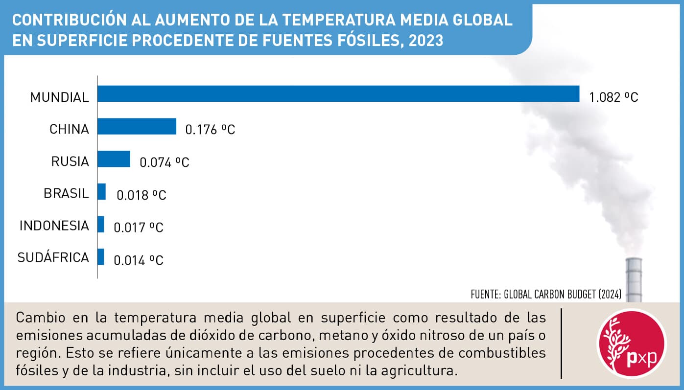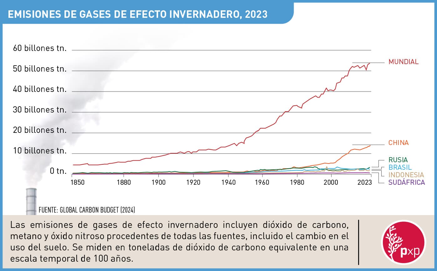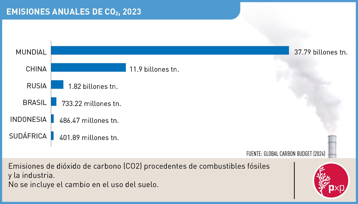 Eso por un lado, pero –al igual que Estados Unidos– los BRICS se encuentran entre los países que más contribuyen con emisiones de gases de efecto invernadero (GEI), algunos de ellos con empresas estatales que son líderes de la industria hidrocarburífera, además de tratarse de economías muy dispares entre sí y que además enfrentan contextos políticos muy diferentes, lo cual es un obstáculo para la coordinación efectiva de acciones climáticas.
