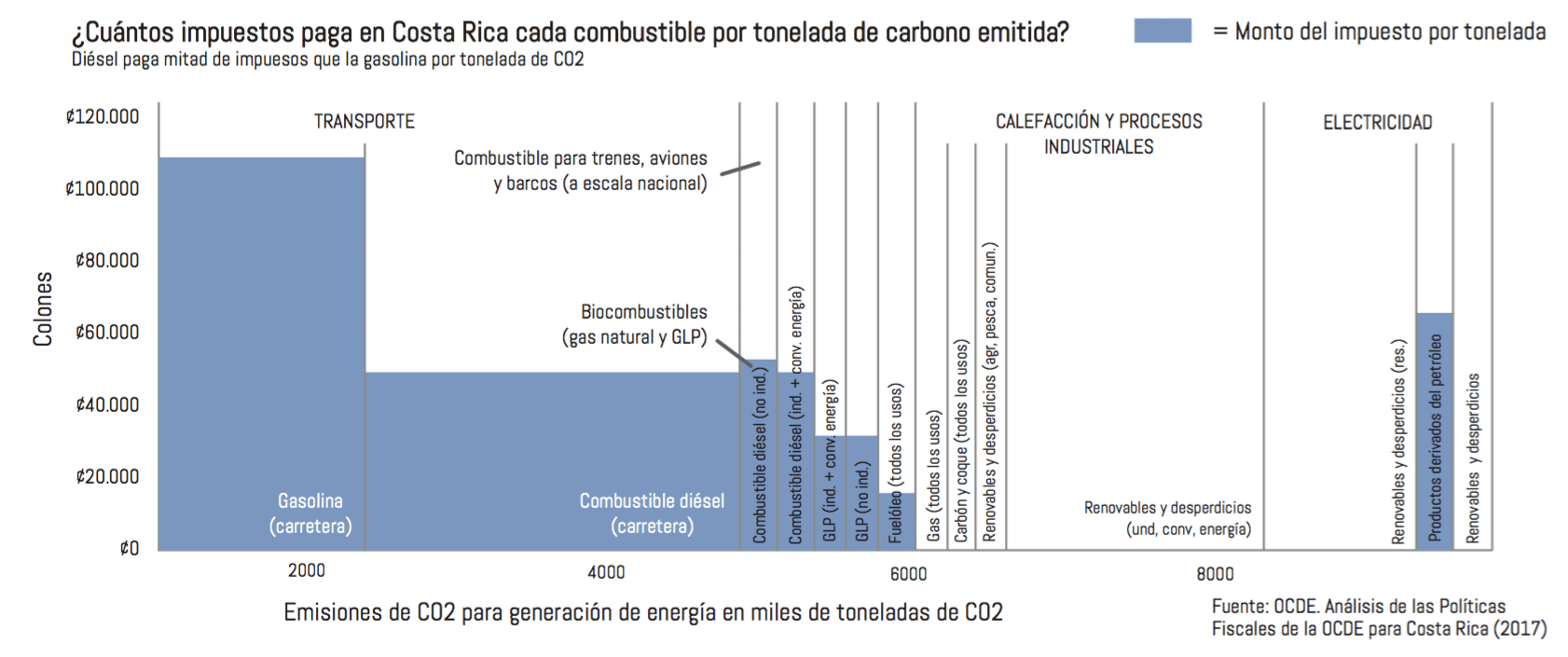 En la actualidad, el diésel puede generar mayor contaminación que la propia gasolina, pero, para la OCDE, el sistema tributario no grava eso de forma efectiva. Así, en la práctica, los costarricenses pagan cerca de ¢110 mil por cada tonelada de dióxido de carbono que se emite al usar gasolina. Sin embargo, si en lugar de usar gasolina usan diésel, pagan cerca de 50 mil colones por cada tonelada de dióxido de carbono emitido.