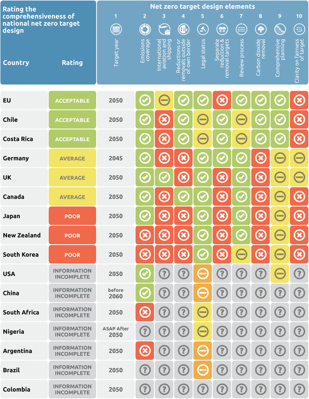 En cuanto a las metas de carbono neutralidad, las de Costa Rica -al igual que Chile y la Unión Europa- fueron calificadas como “aceptables”, mientras que las de Alemania, Reino Unido y Canadá como “promedio”. Las metas de Japón, Nueva Zelanda y Corea del Sur, por su parte, fueron calificadas como “pobres”.