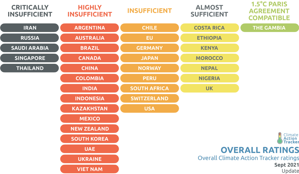 Climate Action Tracker (CAT) también publicó un reporte en que analiza las metas climáticas de 37 países y solo uno, Gambia, tiene una acción climática compatible con la meta de 1,5°C del Acuerdo de París.