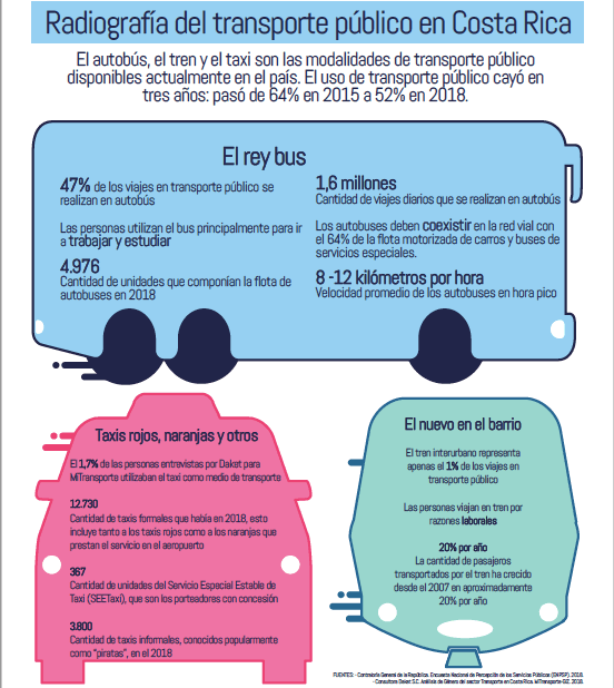En Costa Rica, las mujeres son quienes más utilizan el transporte público, sobre todo el autobús. Lo usan para ir a hacer trámites, trasladarse al trabajo o al centro de estudio. También caminan y recurren a servicios informales para hacer trámites, labores de cuido o regresar a casa tras actividades de ocio.
