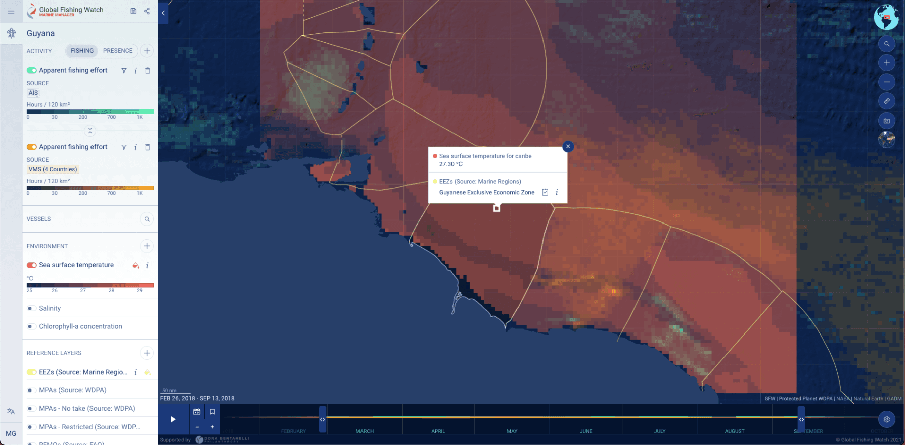 Global Fishing Watch, organización que auspicia el portal, busca mostrar el comportamiento de la pesca a nivel global. En el 2016 desarrolló una plataforma en la que muestra la ubicación de más de 70.000 barcos pesqueros a nivel global, dando la oportunidad de realizar un monitoreo de la actividad pesquera del mundo de forma pública y transparente.