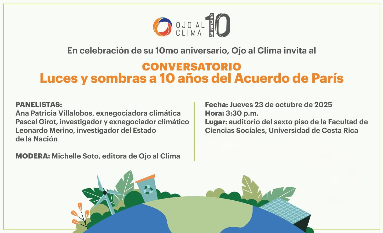 El objetivo del conversatorio es, mediante la reflexión y el análisis, poner en perspectiva lo que ha significado este tratado climático para Costa Rica, pero también estableciendo un diálogo entre el acontecer nacional e internacional.