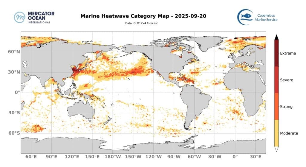 En cuanto a los océanos, la temperatura media global de la superficie del mar (SST) en setiembre de 2025 fue de 20,72 °C, siendo este el tercer valor más alto registrado para ese mes y tan solo 0,20 °C por debajo del récord de setiembre de 2023.