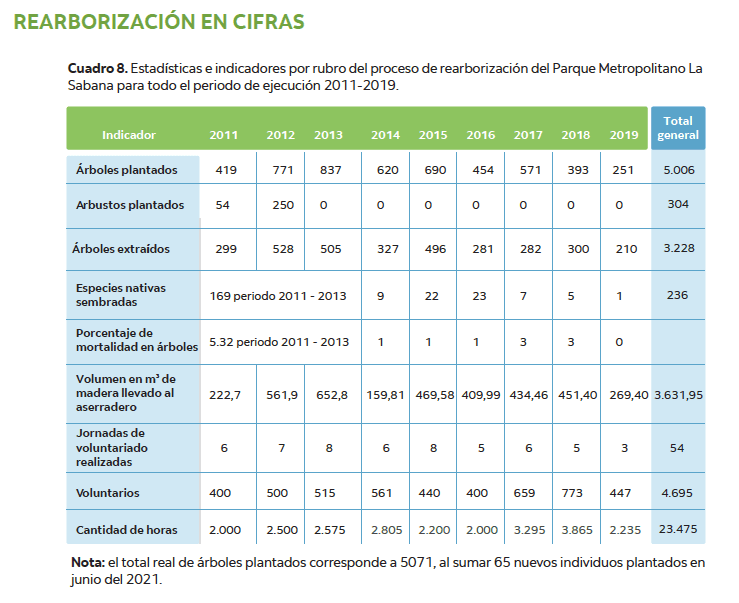 La extracción de árboles y las jornadas de siembra se realizaron entre 2011 y 2019. En total fueron 54 jornadas de voluntariado, en las que participaron 4.695 personas y 93 organizaciones.