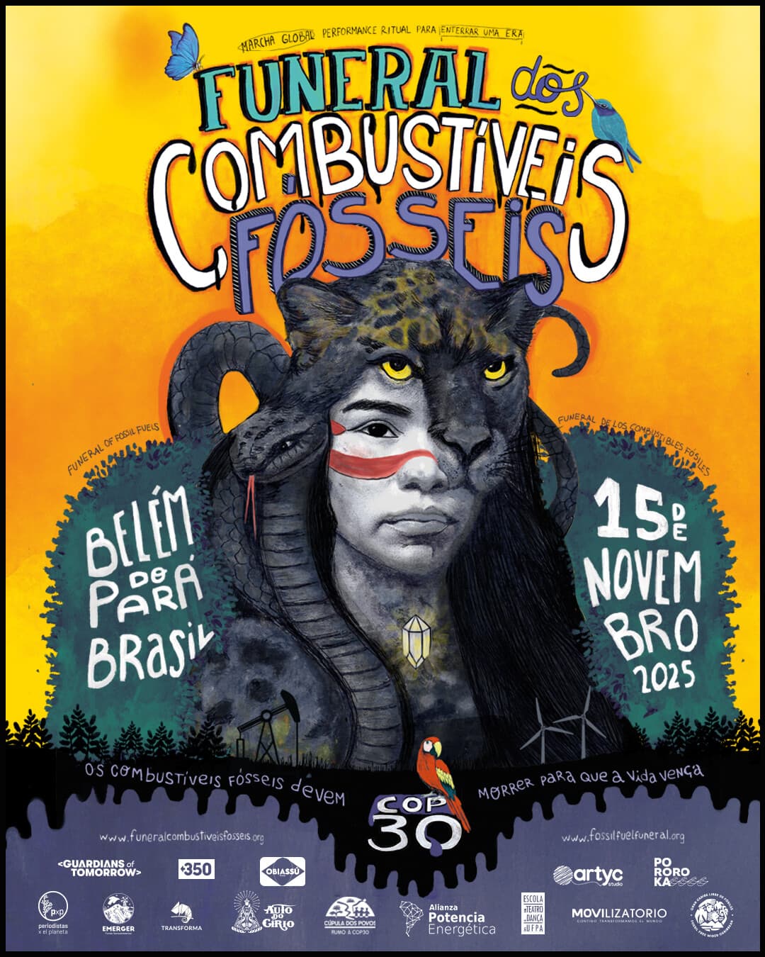 Justo así fue el funeral: mientras las lloronas lamentaban el fin de la era de los combustibles fósiles, la biodiversidad –representada por más de 80 jaguares y una serpiente de 30 metros– celebraba el inicio de una era donde el sol y el viento llevan energía a las comunidades en condiciones justas.